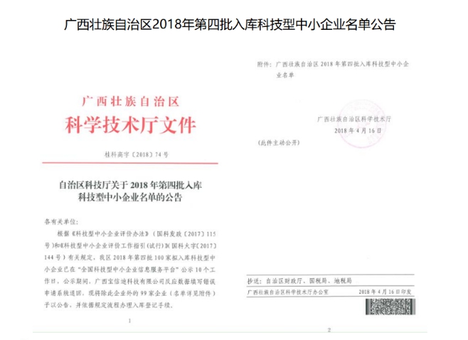 2018年4月16日,广西壮族自治区科技厅发布2018年第四批入库科技型中小企业名单公告,k8凯发集团集团两家子公司k8凯发集团环境和k8凯发集团科技成功入库,其中k8凯发集团环境是再次、k8凯发集团科技是首次入库。