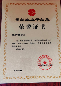 苏广爽同志捐献造血干细胞荣誉奖章及证书