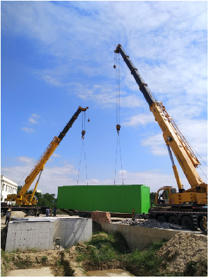 查看详情 >>10月21日,处理量为500m3/d和300m3/d的一体化设备“DMBR双膜内循环生物反应器”成功运送并吊装到合浦县党江镇污水处理站项目部。党江污水处理站位置临海,场地松软、吊装距离远。为完成吊装任