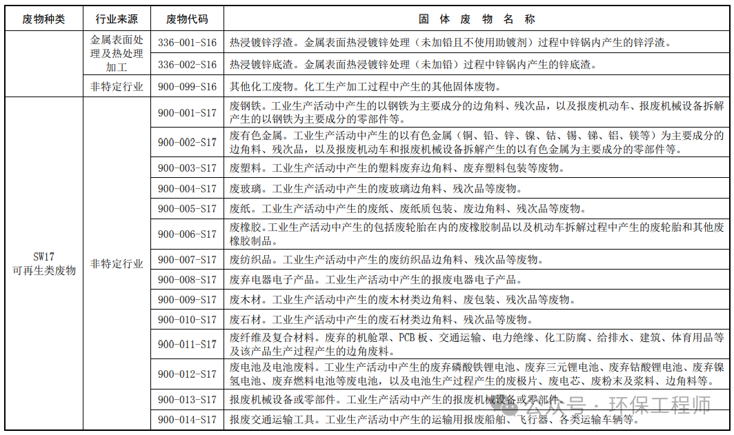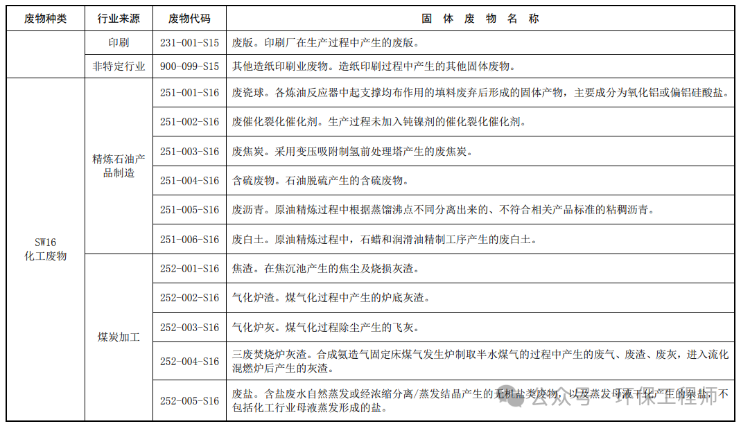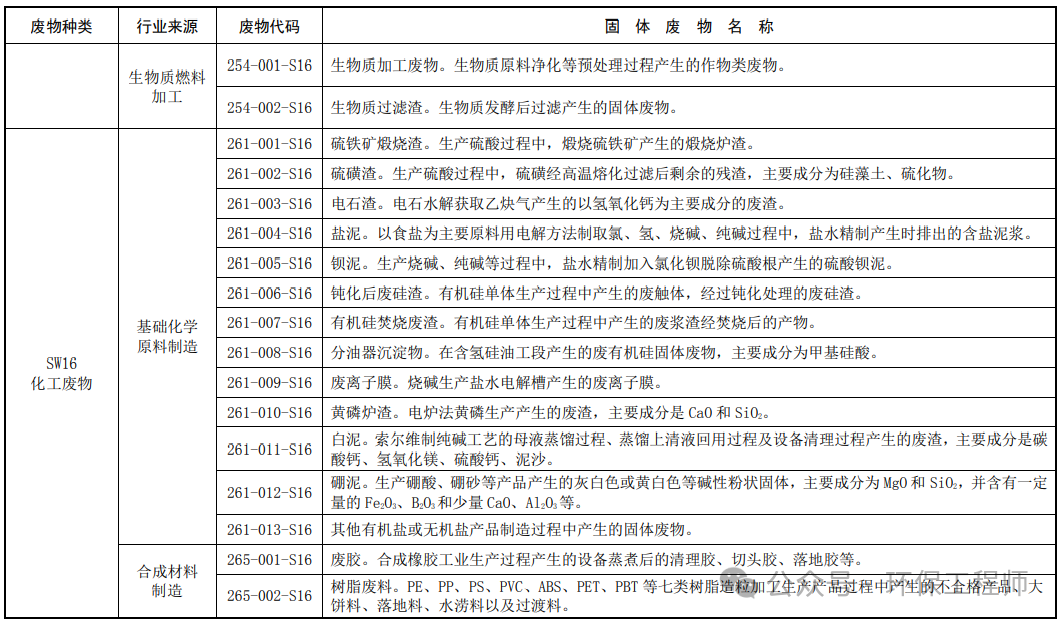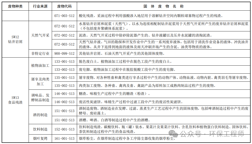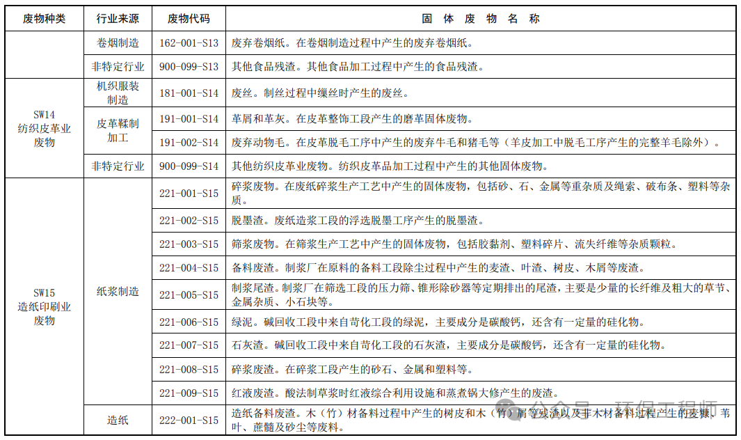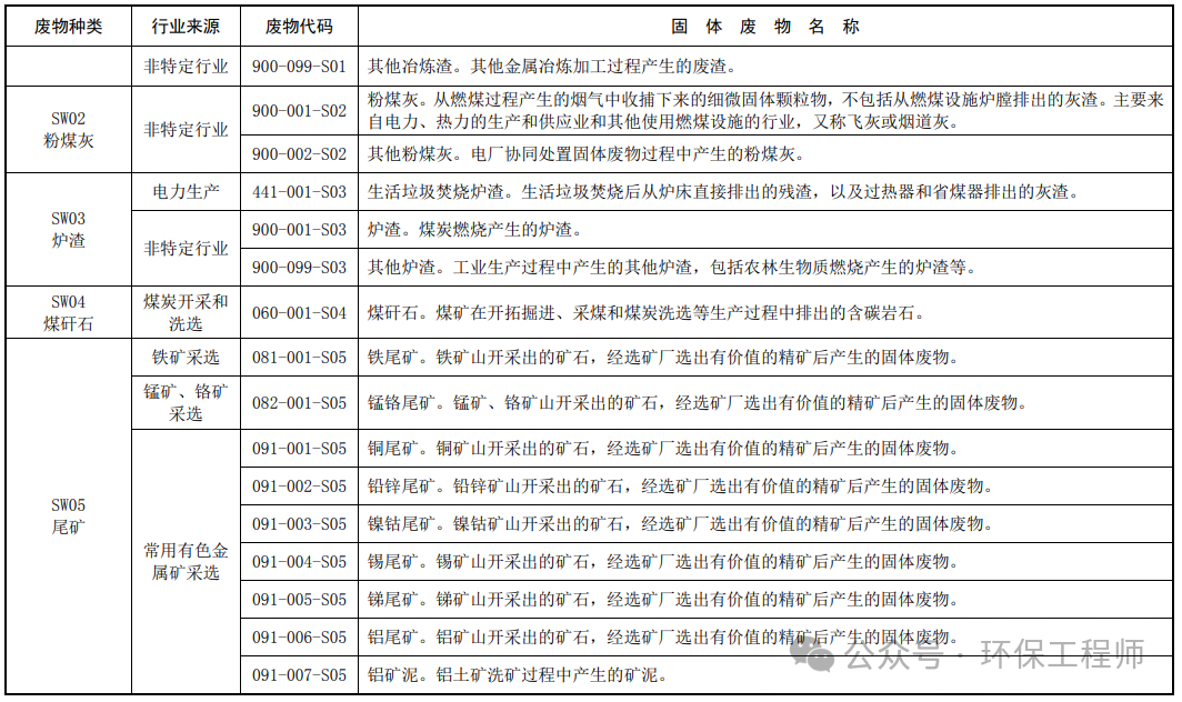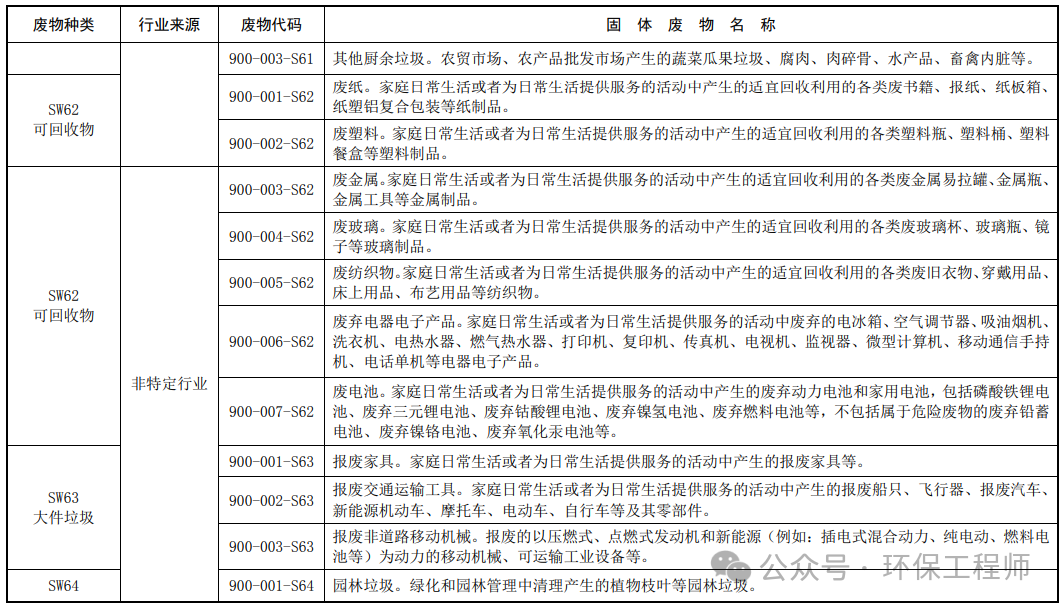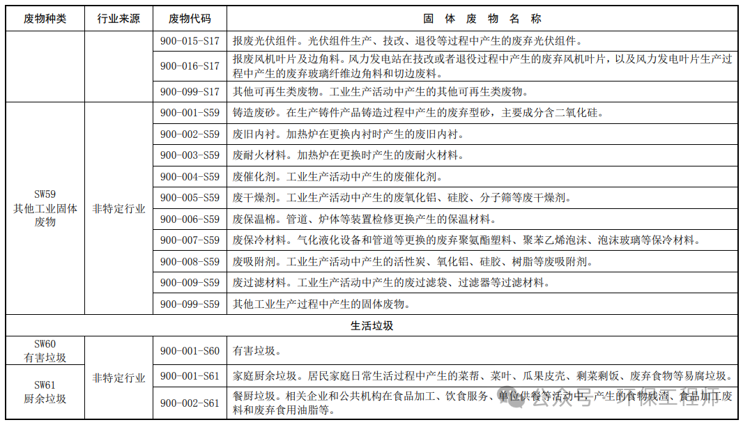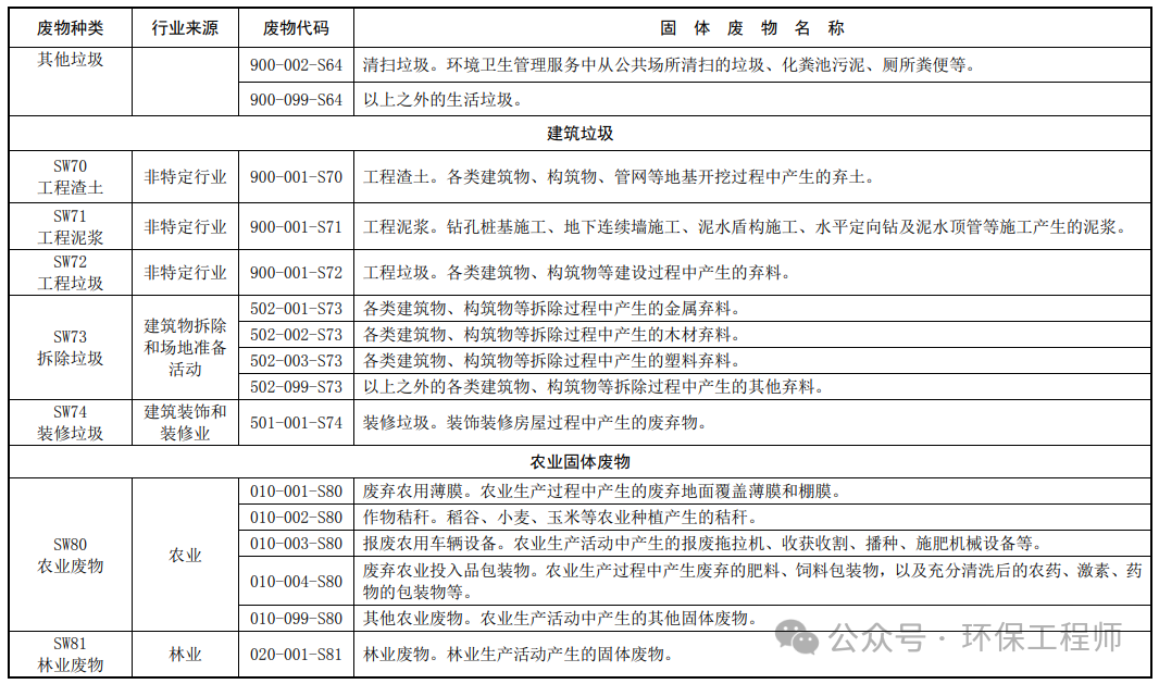 第六条 本目录中有关术语的含义如下:(一)废物种类,是指工业固体废物、生活垃圾、建筑垃圾、农业固体废物和其他固体废物的二级分类。(二)行业来源,是指固体废物对应的产生行业,对照《国民经济行业分类》(GB/T 4754-2017)进行确定。(三) 固体废物名称,包括简称和描述两部分, 固体废物简称 按照行业规范或约定俗成的方式进行命名, 固体废物描述部分是对 固体废物较为全面的定义, 主要从使用原料、生产工艺、产生环节、物理性状、主要成分及污染特性等方面进行描述。